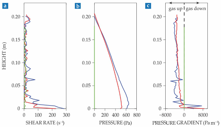 Pyroclastic flows glide across the ground surface on hot air. The blue, red, and green lines denote the flow properties at 380 ms, 690 ms, and 1290 ms, respectively, at a static observation point. The measured shear rate (a) varies with the height of the flow by three orders of magnitude and (b) forms a pressure maximum a few centimeters above the flow’s base. The resulting pressure gradient (c) moves air downward toward the lower-pressure area, effectively lowering the particle concentration and decreasing friction so that pyroclastic flows can travel at high speeds for long distances.