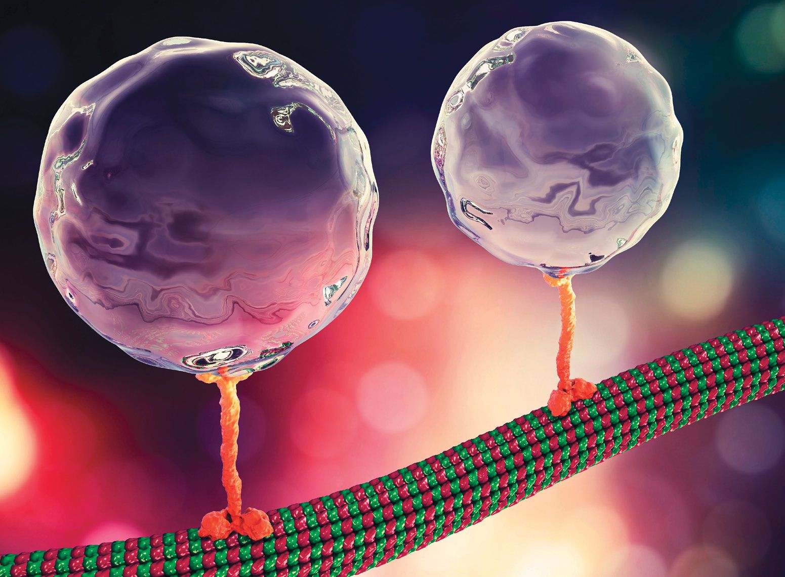 Kinesin, shown in this artist’s illustration in orange, is a motor protein that carries cargo (transparent spheres) around inside a cell. The kinesin walks along a microtubule (part of the cell’s cytoskeleton, shown in green and red) by moving its feet alternately, one in front of the other. But until now, its movement was too fast to be directly studied in detail. (Image by Kateryna Kon/Shutterstock.com.)
