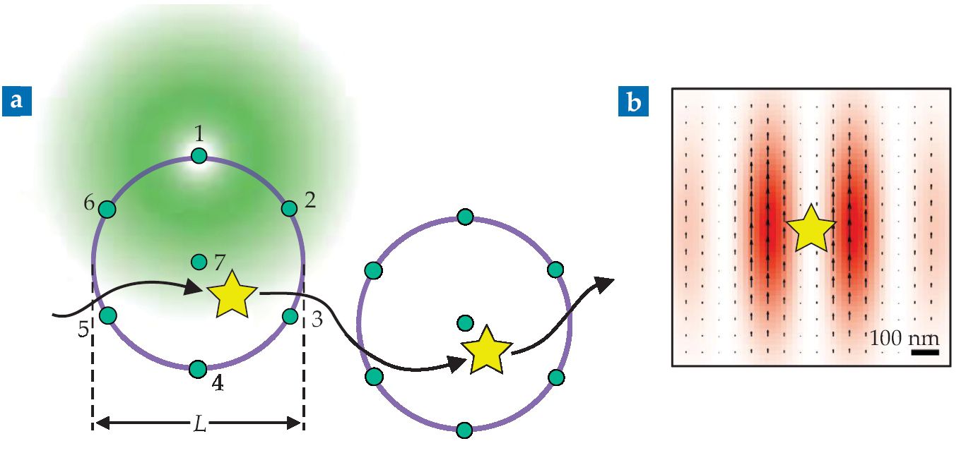 MINFLUX, an optical fluorescence technique, finds the positions of fluorescent molecules (yellow stars) quickly and precisely, using minimal fluorescence photon flux. In its original, recently commercialized version (a), a doughnut-shaped light beam (green) probes several positions around a circle that’s thought to contain the molecule. The circle diameter L is iteratively reduced to find the molecule with nanometer precision. In a newly developed version of the technique (b), the doughnut beam is replaced with a linear interference pattern (red). Even though the molecule must now be localized in the horizontal and vertical directions separately, the localization is faster and more precise. (Panel a adapted from ref.