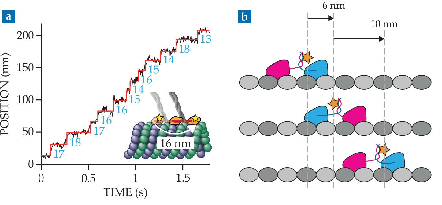 That question was first answered in 2004 by the University of Illinois at Urbana-Champaign’s Paul Selvin and colleagues using a technique called FIONA (which stands for “fluorescence imaging with one-nanometer accuracy,” although it doesn’t produce complete images, and the resolution in practice is coarser than 1 nm). They attached a robust fluorophore to a kinesin foot and collected the requisite thousands of photons to localize its position. It was already known from other methods that the kinesin body moves 8 nm with each step. Selvin and colleagues found that the foot moved 16 nm at a time, a clear sign that the feet moved alternately in a walking motion. 4