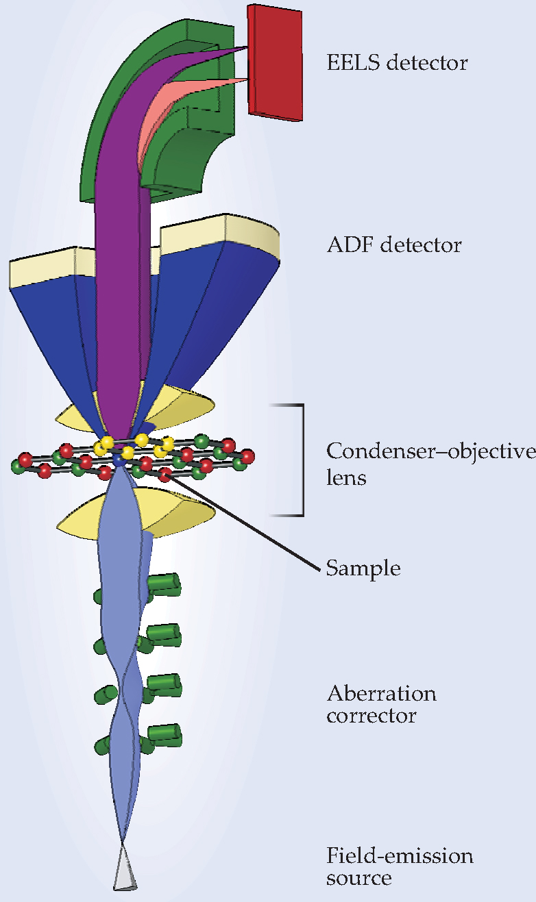 Figure 2. Schematic of a scanning transmission electron microscope equipped with two types of detectors. Electrons emerging from the field-emission source pass through an aberration corrector and are then focused by the first half of the microscope’s main lens (the condenser-objective lens) and scanned over the sample. Transmitted electrons pass through the second half of that lens onto one of the two detectors: The electron-energy-loss spectrometer (EELS) measures the energy loss of the forward-scattered electrons. The annular dark-field (ADF) detector is a scintillator that monitors the intensity of electrons scattered at wide angles.
