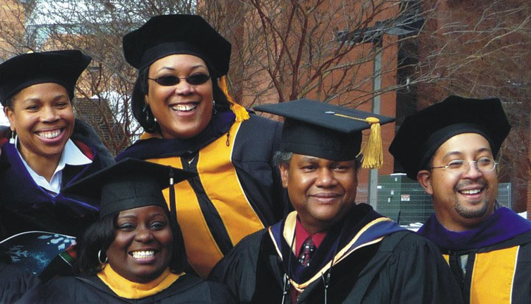 Students in Promise, an NSF-funded support network for graduate students at the University of Maryland, Baltimore County, pose at a December 2009 graduation ceremony with their thesis and dissertation coach Wendy Carter, far left, and physics professor Anthony Johnson, front center. Next to Carter is information systems PhD graduate Heather Holden, and flanking Johnson are physics master’s degree graduate Shelly Watts and physics PhD graduate Robinson Kuis.