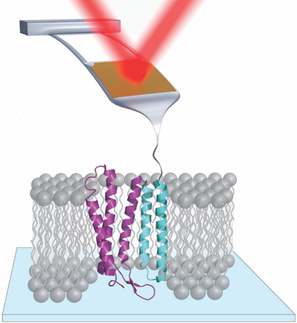 Although the JILA researchers performed proof-of-principle tests along the way to check their modified cantilevers’ time resolution and force precision, the new work represents their first move toward a system of biophysical interest. Bacteriorhodopsin, a protein in the cell membrane of saltwater-dwelling single-celled organisms, is homologous to G-protein coupled receptors (GPCRs), an important class of membrane proteins in more complex organisms, including humans. The receptors are responsible for many types of cellular signaling, and as such, they’re the targets of some 40% of all pharmaceutical drugs.