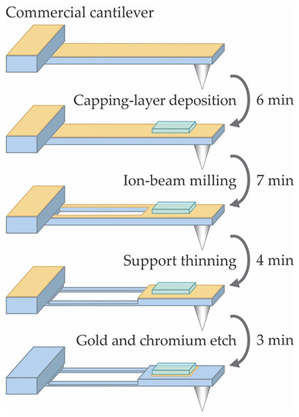 Figure 2. A commercial cantilever in an aqueous environment creates too much hydrodynamic drag for microsecond-resolution force spectroscopy, and its gold coating causes force measurements to drift over time. To overcome both those problems, Thomas Perkins and colleagues modify the cantilevers with the quick four-step protocol shown here. (Adapted from ref.