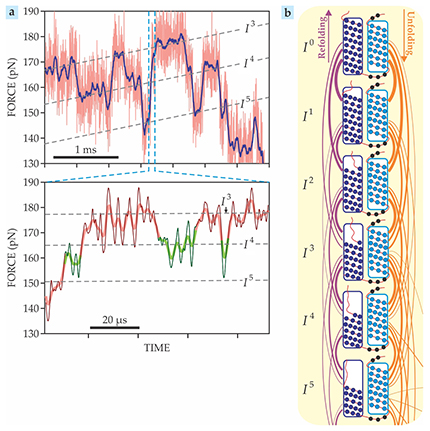Figure 3. Unfolding two helices of bacteriorhodopsin revealed 14 stable intermediate states (In for n = 1–14, with I0 representing the fully folded helices), most of which had never been detected before. (a) Force–time plots show the molecule hopping among the third, fourth, and fifth intermediates, indicated by the dashed lines. As highlighted by the green segments in the bottom panel, sometimes intermediates are occupied for just a few microseconds. (b) The first five intermediates, schematically shown here, span the unfolding of half of the first (dark blue) helix. The orange and purple curves indicate the likelihood of various unfolding and refolding transitions. (Adapted from ref.