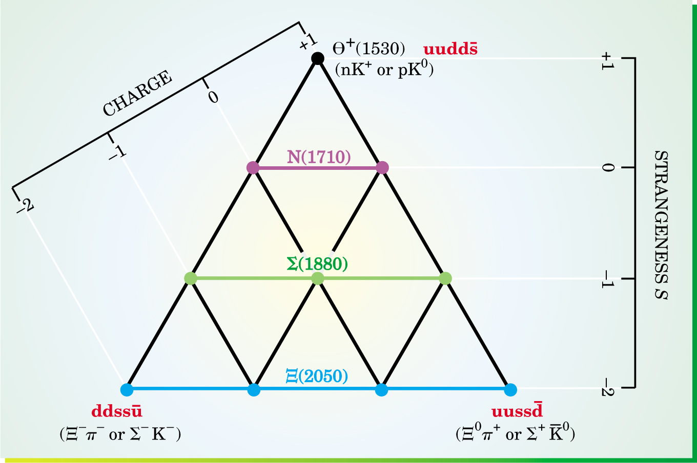 Figure 1. At the corners of the antidecuplet of baryons predicted by Dmitri Diakonov, Victor Petrov, and Maxim Polyakov are three exotic states that require five valence quarks (shown in red) and their decay modes. The recently discovered positive-strangeness baryon near 1540 MeV is tentatively identified with the predicted ⊝+(1530). The numbers in parentheses are the predicted masses (in MeV) of the charge multiplets for each value of the strangeness.