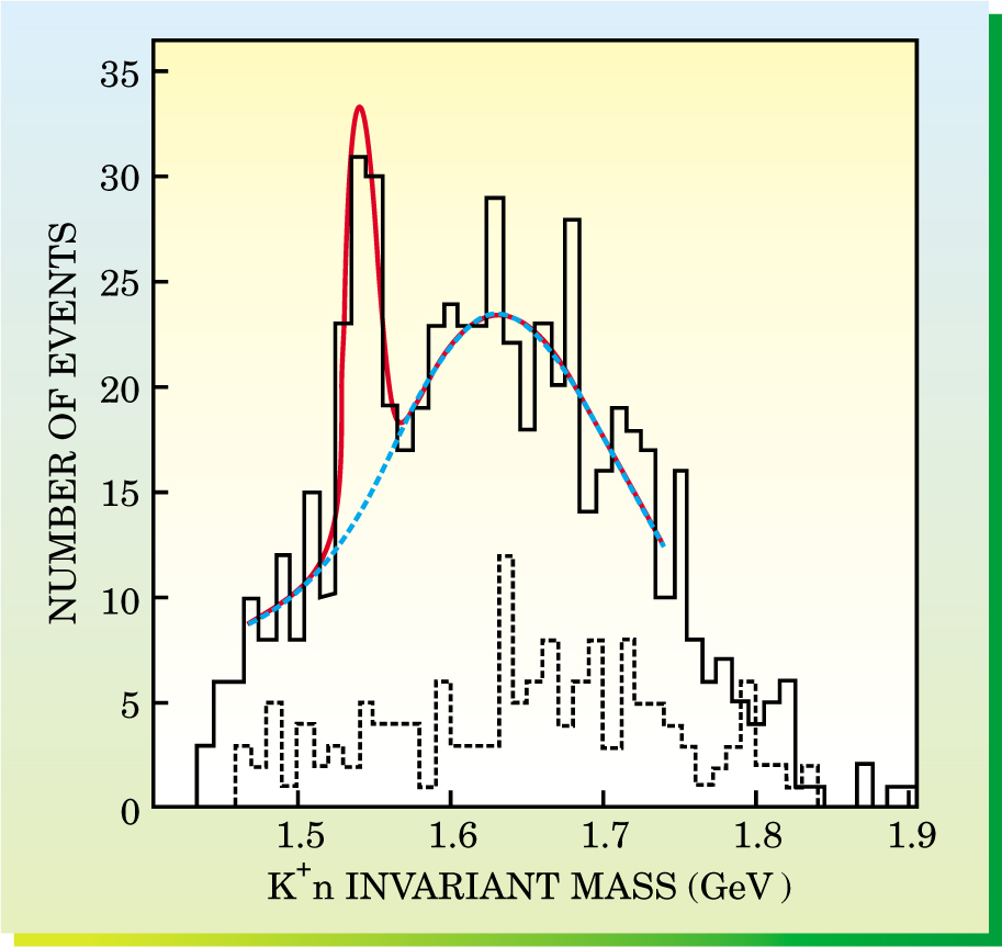 Figure 2. The strongest evidence to date for the exotic, positive-strangeness ⊝+ baryon is the 5.3-standard-deviation peak (fitted with the red curve) centered at 1542 ± 5 MeV in this K+n invariant-mass distribution from a Jefferson Lab experiment in which K+K−pairs were photoproduced on a deuterium target. The blue curve is a fitted estimate of the background, and the dashed histogram indicates collisions excluded because they produced a Λ0 baryon.