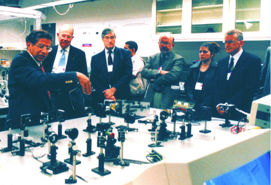 The mirrors and lenses of a laser experiment at Jefferson Lab were on display for forum participants.