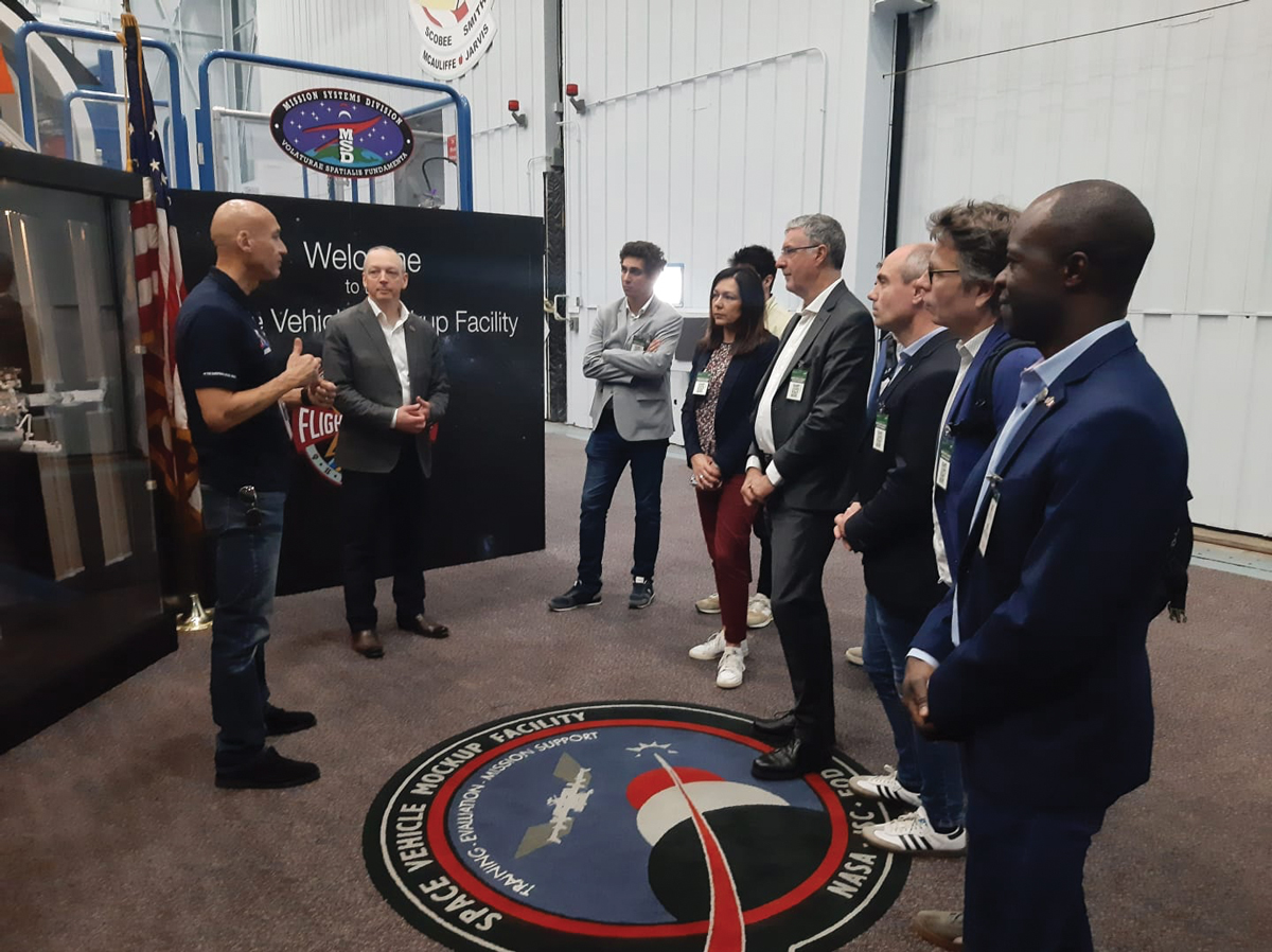 Representatives from French startups in the Texas–France space accelerator inaugural class visit NASA’s Johnson Space Center in Houston, Texas, in April. (Photo by David Alexander.)