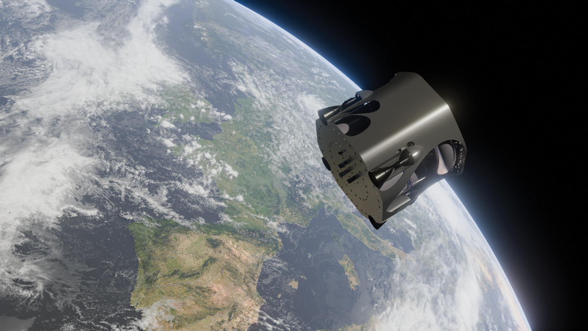 A small satellite propulsion system orbits above Earth in this illustration from Agena Space, a French company that is developing nontoxic liquid propellants. (Image from Agena Space.)