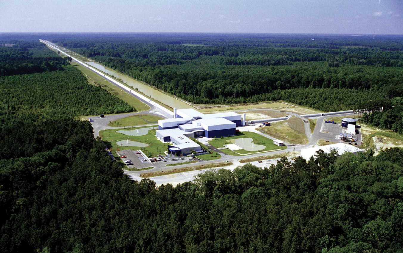 At LIGO’s twin detectors—this one in Livingston, Louisiana, and the other in Hanford, Washington—powerful laser light circulates in perpendicular 4-km-long arms. Through interferometry of the light from the two arms, researchers can detect changes in the arm lengths of less than 10−18 m. (Photo courtesy of Caltech/MIT/LIGO Lab.)