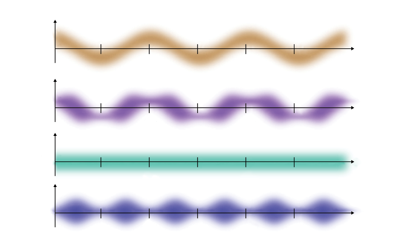 Squeezing light shifts the quantum uncertainty from evenly spread along the waveform (brown) to concentrated in just one part (purple). Electromagnetic vacuum states, too, can be either unsqueezed (green) or squeezed (blue). (Adapted from R. Schnabel., Phys. Rep. 684, 1, 2017
