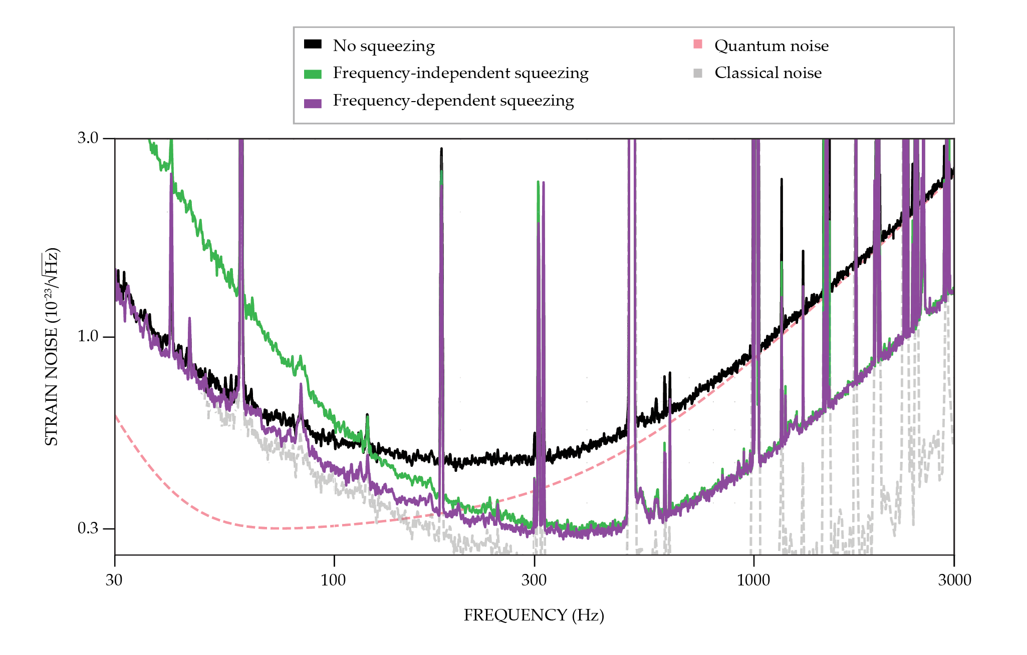 Noise at LIGO’s Livingston detector (black) consists of classical noise (gray) and quantum noise (pink). Using squeezed light can substantially reduce the quantum noise at high frequencies—but the initial approach, frequency-independent squeezing (green), also increases the noise at low frequencies. LIGO researchers have now implemented frequency-dependent squeezing (purple), which reduces the noise across many frequencies without increasing it anywhere. (Adapted from ref.