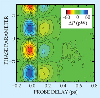 Figure 3. Current oscillations reveal themselves by the frequency-doubled light they induce. In this plot, the phase parameter, as described in the text, determines the initial amplitude and direction of the current. For a fixed phase, the current-induced power ΔP in frequency-doubled light oscillates as a function of time between current injection and second-harmonic generation. Both the lasers that inject current and the laser that triggers SHG have finite pulse widths. For that reason, current is observed even before the nominal injection time t = 0. (Adapted from ref.