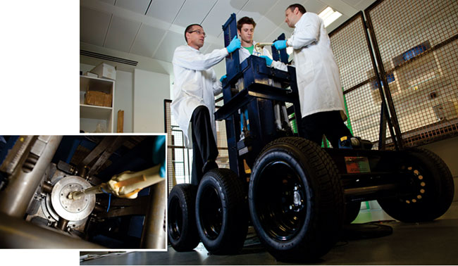 The anti-vehicle, underbelly, blast- injury simulator, or AnUBIS, is used for laboratory studies of the impact of roadside blasts. Anthony Bull (left), director of the new Royal British Legion Centre for Blast Injury Studies at Imperial College London is standing on the rig with student Nic Newell (center) and research fellow Lieutenant Commander Tim Bonner. The inset shows a bone model mounted on AnUBIS and the metal plate that will rush up when a shear pin fails under pressure.