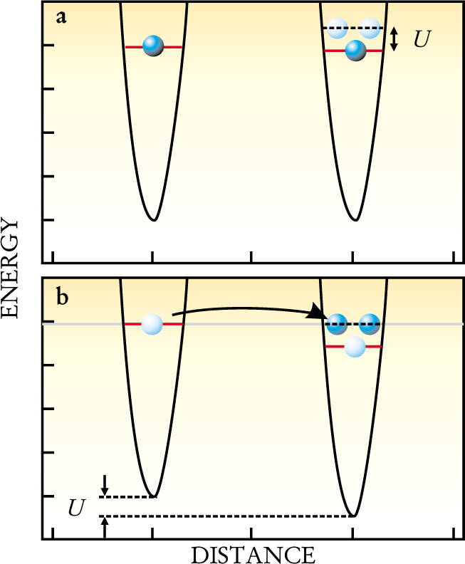 Figure 2. Intersite Interaction. (a) Two atoms (dark blue balls) occupy neighboring potential wells. U is the energy cost for them to be in the same well (pale blue balls). (b) Lowering one well relative to the other allows atoms originally in separate wells (light blue) to occupy the same well (dark blue).