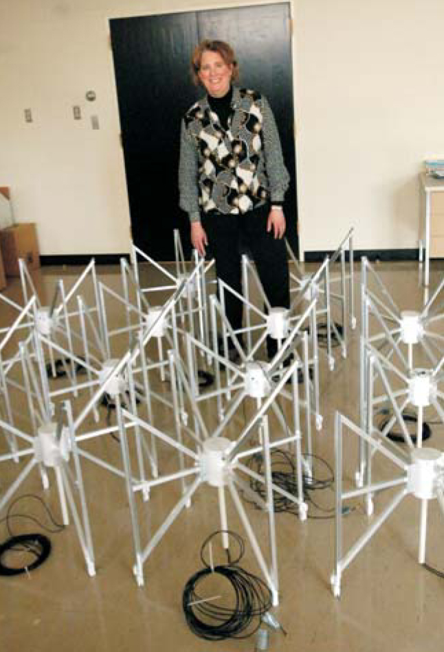 A radio telescope array that would probe the early universe from the far side of the Moon is one of 19 missions NASA has selected for further study. A prototype is shown with the project’s leader, MIT’s Jacqueline Hewitt.
