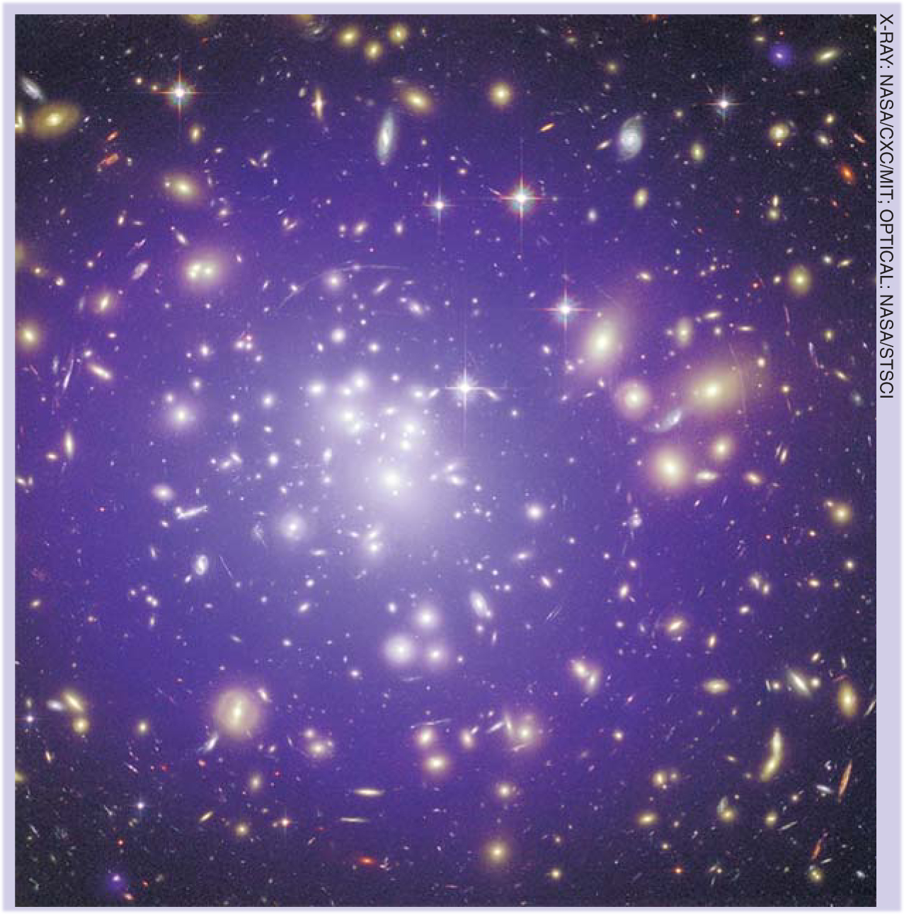 Figure 1. Abell 1689 is one of the biggest, most massive galaxy clusters. The x-ray emission, measured by the Chandra orbiter and shown here in purple, comes from hot baryons that occupy the cluster’s gravitational potential. The cluster’s temperature distribution (not shown) indicates the cluster has merged with another cluster. Whether Abell 1689 can continue to fatten depends in part on how fast the universe is expanding.