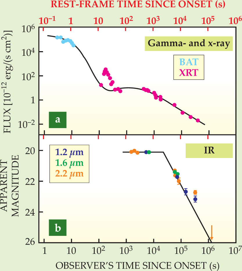 figure 1. Light curves for the record-redshift (z = 8.26) gamma-ray burst GRB090423, plotted in the GRB’s rest-frame time and the observer’s time, which is dilated by 1+z.(a) Fluxes recorded by the Swift orbiter’s burst-alert telescope (BAT, 15–150 keV) and its x-ray telescope (XRT, 0.2–10 keV). (b) Waning IR brightness as recorded in three wavelength bins by telescopes in Hawaii and Chile. Fitted curves in both panels are from simple GRB models.
