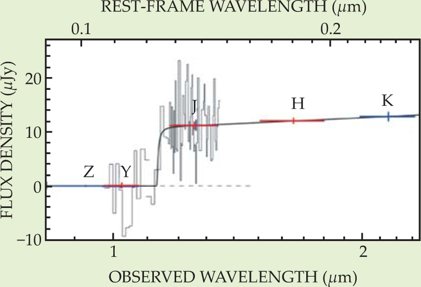 Figure 2. IR spectrum (the noisy gray curve) recorded 17 hours after the onset of GRB090423 with the 16-m Very Large Telescope in Chile. The GRB’s redshift is determined primarily from the fitted wavelength of the Lyman-α absorption break near 1.1 µm. (In the laboratory, the Lyman-α line is at 122 nm in the UV.) The fitted break position is strengthened by photometric observations (the colored data points labeled by IR wavelength band) recorded much earlier by various ground telescopes. The absence of any photometric signal blueward of 1.1 µm was the first evidence that the GRB had a record redshift.