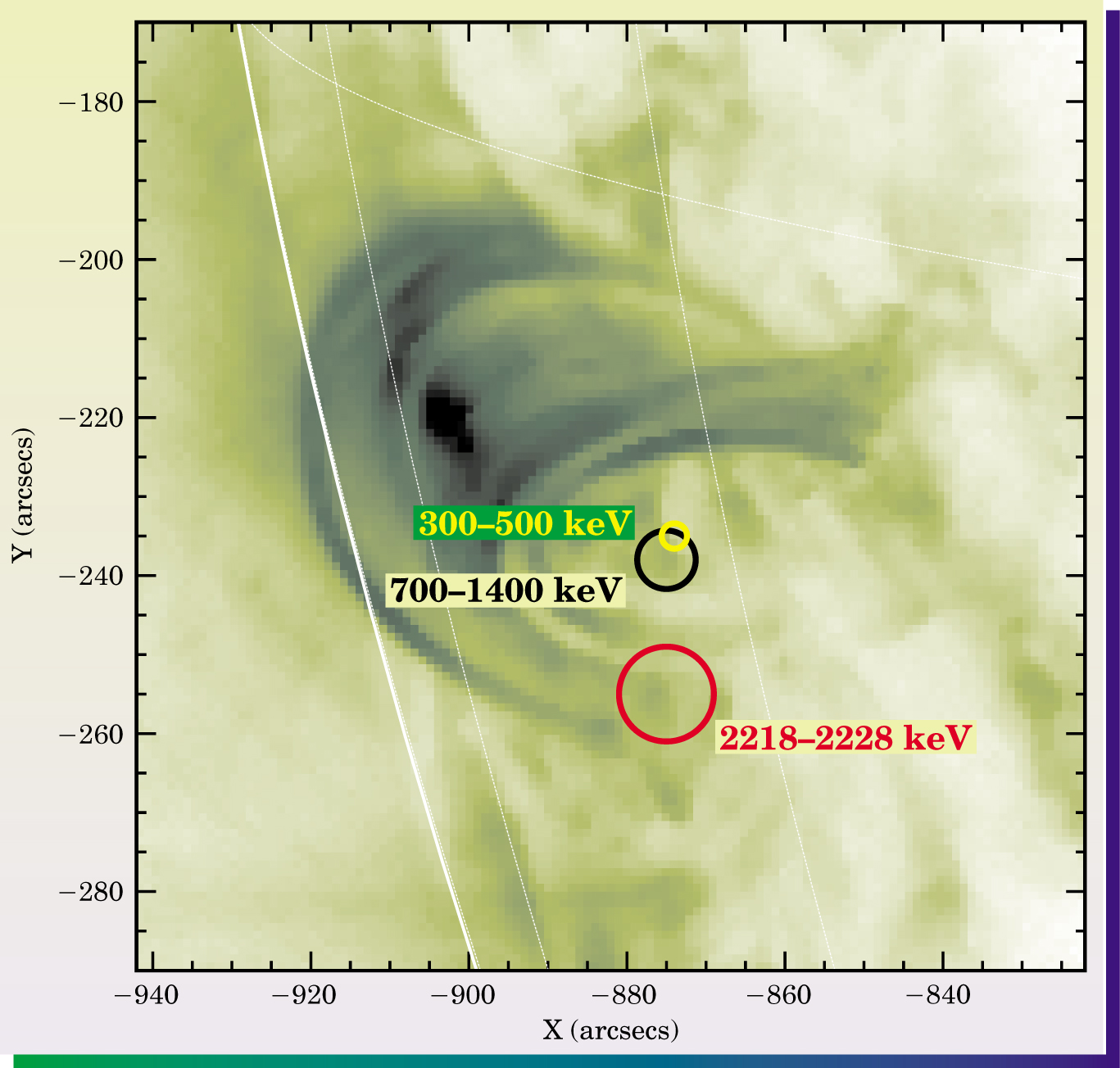 They also saw a bright narrow line at 2.223 MeV. This line, predicted to occur in flares by RHESSI’s dedicatee, Reuven Ramaty, is an aftereffect of ionic collisions. Accelerated ions knock out neutrons from ambient ions. Once slowed by thermalization, ejected neutrons can be captured by ambient protons to make deuterium ions and 2.223-MeV gamma rays. Although the thermalization is somewhat slow, the line serves to locate the impulsively accelerated ions because the neutrons don’t stray far. Filtering RHESSI data through a narrow energy window of 2.218–2.228 MeV yields a rich, barely adulterated clutch of capture-line photons.