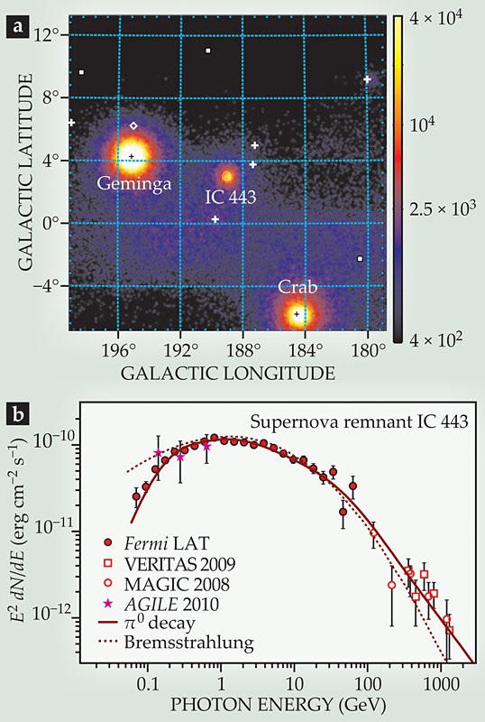 Figure 1. Supernova remnant IC 443, a bright source of gamma radiation. (a) Sky map of IC 443’s vicinity from observations by the Fermi Gamma-Ray Space Telescope is color coded by total gamma-photon counts per (0.1°)2 recorded over four years by Fermi’s Large Area Telescope (LAT). Nearby are two other bright sources dominated, unlike IC 443, by pulsar radiation. Marked in white are faint point sources. (b) Energy spectrum of IC 443’s gamma radiation measured by LAT and other gamma-ray telescopes. The photon-count spectrum dN/dE is multiplied by E2. Curves show best fits to the LAT data for models assuming only bremsstrahlung from accelerated electrons or only two-gamma decay of neutral pions created by accelerated protons. (Adapted from ref. 1.)