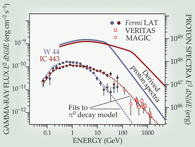 Figure 2. Gamma-ray spectra from supernova remnants (SNRs) IC 443 and W 44, measured by the Fermi orbiter’s Large Area Telescope and other instruments. The kinetic-energy spectrum for protons accelerated in each SNR is derived from the best π0-decay model fits to the LAT data. Enough such derived proton spectra should reveal what fraction of the intragalactic cosmic-ray flux originates in SNRs. (Adapted from ref. 1.)
