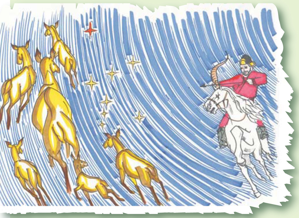Take the bamboo shaft. In a legend from northern Thailand, a woman symbolically separates her son from his wife by placing a bamboo shaft between their graves. The red star (Betelgeuse) that is Orion’s shoulder in the western constellation is Upem, the bride, and the bright blue star (Rigel; Orion’s leg) on the opposite side of the bamboo shaft is Khun Sarm Lor, the groom. In the Japanese myth “Two Heavenly Sisters,” Orion’s belt is the bamboo pole used by a girl to carry two buckets of water. Chased by a devil, the girl and her older sister escape by climbing a rope to the heavens. The older sister becomes the Moon, and the younger sister’s remaining leg—the devil got the other one—sticks out from her kimono, forming what in the West is known as Orion’s scabbard. In Mongolia, legend has it that a herd of deer ran into the sky to escape a hunter and became the red deer constellation (see picture above). Betelgeuse, according to the legend, is the hunter’s arrow; the star looks red because the arrow was bloodied by a deer it wounded. The three stars at a slant below the “belt” deer are fawns.