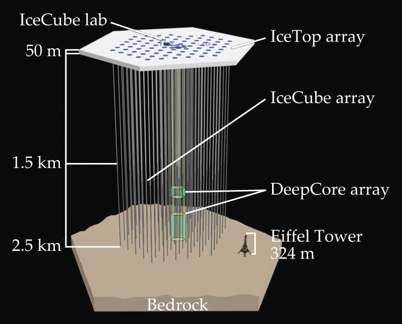 IceCube, shown in figure 1, comprises 86 instrumented strings, hexagonally arrayed with a spacing of 125 m and extending down 2.5 km from the polar surface. They were imbedded over the last decade when hot-water drills briefly melted deep, narrow holes. IceCube was designed to determine the flux of high-energy neutrinos from a variety of astrophysical point sources by recording the directions and energies of high-energy muons created in rare neutrino collisions with nuclei in the ice.