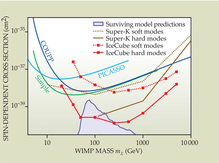 Those cross-section limits are plotted in figure 3, along with recent limits from three nuclear-recoil searches. Also shown are earlier limits from Super-Kamiokande, 2 the 50-kiloton Japanese neutrino detector that pioneered the search for WIMP annihilation in the Sun.