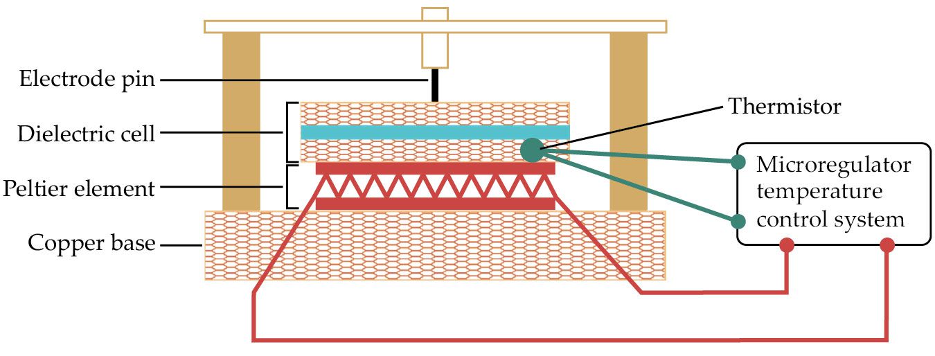 A molecular liquid (turquoise) undergoes structural relaxation, known as aging, after being subjected to small temperature changes. The evolution of the 50-μm-thick layer’s capacitance refl ects changes in its microscopic confi guration. An electrode and dielectric cell measure the liquid’s capacitance; a thermistor and a Peltier element monitor and regulate its temperature. (Adapted from ref.