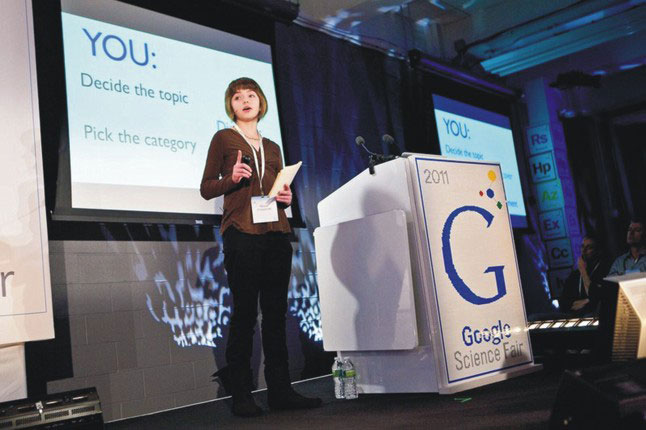 At the contest’s launch, 14-year-old Tesca Fitzgerald, shown above, presented her winning entry from a previous science fair as a sample project: an algorithm that reduced the variance of an artificial-intelligence software in robots that could deliver linen and other items to hospital patients.
