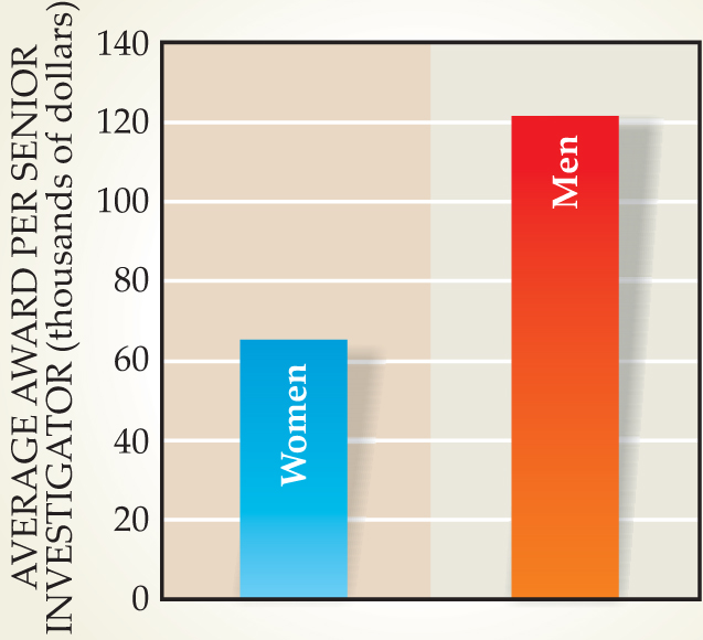 The analysis revealed that men got $123 850 per year on average, compared with $64 310 for women. The average for group grants was slightly higher than for individuals, but the gender disparity remained.