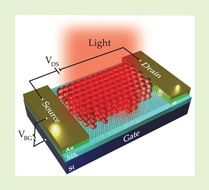 A hybrid graphene phototransistor. Gold electrodes are the source and drain on opposite sides of a graphene flake deposited on a silicon dioxide/silicon wafer and coated with light-absorbing quantum dots made of lead sulfide. Incident light generates electron–hole pairs in the dots. Holes are transferred to the graphene and quickly drift toward the drain under the influence of a voltage VDS, while electrons remain trapped in the PbS. Capacitive coupling between the oppositely charged layers modulates the current, which is amplified by the continual replenishment of holes that flow through graphene during the milliseconds that electrons remain trapped. A back-gate voltage VBG can be adjusted to tune graphene’s charge density and maximize the circuit’s light sensitivity. (Adapted from ref.