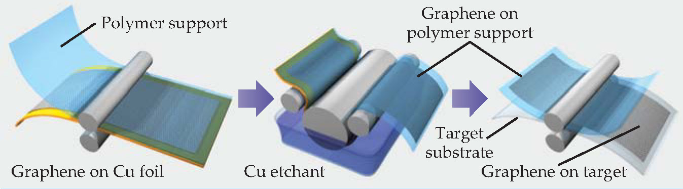 Figure 1. Roll-to-roll production. Chemical vapor deposition of methane on copper foil at 1000°C triggers the catalytic growth of graphene. The graphene-laden Cu is pressed against a flexible polymer support, bathed in an etchant that removes the Cu backing, and then dry transferred to a target—typically another flexible polymer. Multiple layers of graphene, grown one at a time, can be transferred to that target and stacked together—each layer chemically doped in a bath stage similar to that used for etching. The complete process produces a large, flexible, highly conductive, transparent electrode.