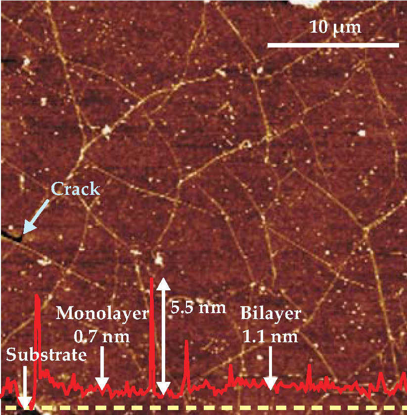 Figure 2. Force microscopy reveals the polycrystalline surface of graphene with its network of wrinkles (white lines) and minor cracks that develop during the mild trauma of cooling and being transferred to a substrate. (White dots are most likely polymer residue.) The height profile (solid red line) of graphene and its wrinkles is measured relative to the substrate along the dashed yellow line. Although a single layer of graphene generally predominates when grown on copper, a graphene bilayer is also evident in the scan.