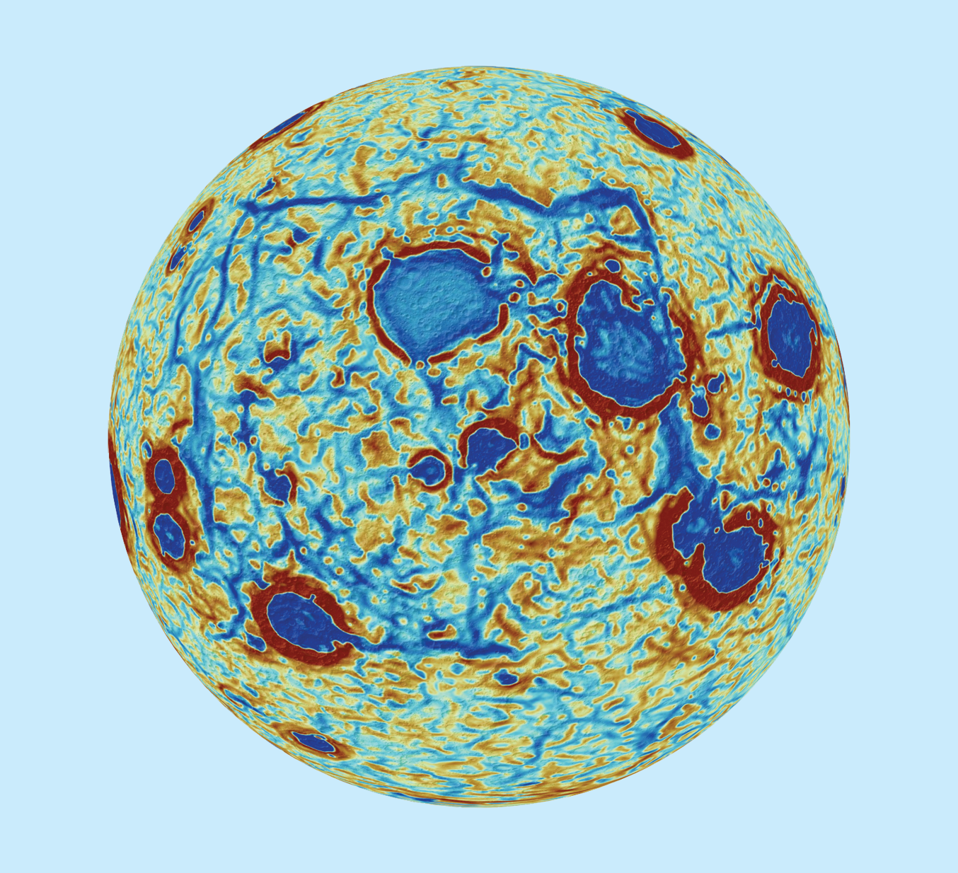 The gravitational field of the near side of the Moon. The map shows the gravitational strength (stronger in blue) after the contributions from the surface features are removed. Rough circles (blue) of gravitational gradients correspond to the craters of the region, but the strange, linear anomalies don’t have a visual counterpart. Rather, they are the signatures of dense material beneath the surface. The presence of titanium-rich materials sinking below the surface can be explained by the overturning of the mantle early in lunar history. (Courtesy of Adrien Broquet/University of Arizona.)