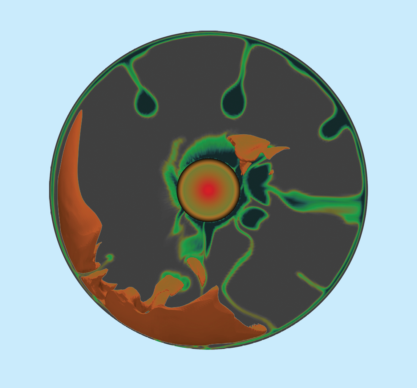 Ilmenite is less viscous than other material in the lunar mantle, and it would’ve been pushed by the force of the impact toward the near side of the Moon—opposite the impact. Zhang and his group use numerical simulations to conclude that the impact not only formed the largest lunar crater but instigated thermal upwellings, shown in figure