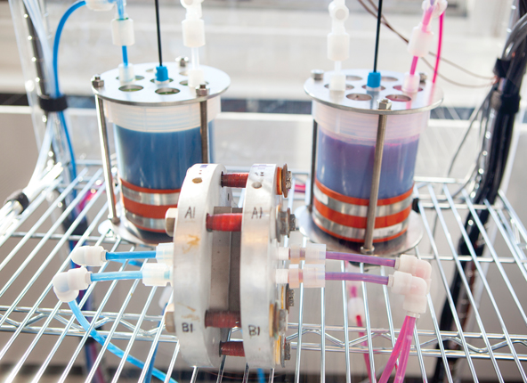 Not all the technologies backed by ARPA–E are flow batteries. The City University of New York, working with a $3.5 million grant, is advancing a rechargeable zinc–manganese oxide cell, the same chemistry used in disposable alkaline batteries. CUNY’s original award was extended for a year to support efforts to reduce dendrite formation and extend the life of the anode, says Jerome Fineman of CUNY’s Energy Institute. The battery has achieved 3000 cycles to date, but he says the institute is aiming to push that number to 5000. Meanwhile, a CUNY spinoff, Urban Electric Power, has licensed and begun marketing the Zn–MnO2 battery and a separate zinc–nickel battery developed without ARPA–E funding, for homes with uninterruptible power needs and for home backup power systems in India and other less developed nations. Last year, the company opened a $6.1 million, 5000-m2 R&D and manufacturing facility in New York’s Harlem district, funded in part by state and local agencies.