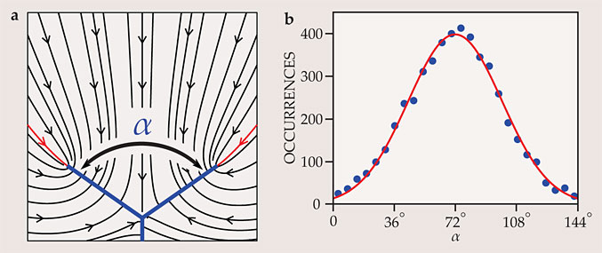 Figure 2. Stream splitting. (a) A branching stream is modeled as a Y-shaped sink (blue) fed by groundwater flow (streamlines in black). Assuming the branches grow in the direction from which groundwater enters their tips—that is, along the path charted by the streamlines highlighted in red—a new model shows that at a critical angle α = 72°, the arms grow perfectly straight. (b) A histogram of the angles formed by nearly 5000 branches in the Bristol tributary network of figure