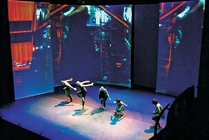 In The Matter of Origins, choreographer Liz Lerman refers directly and indirectly to science; in this scene video images from her visit to CERN are used as the backdrop.