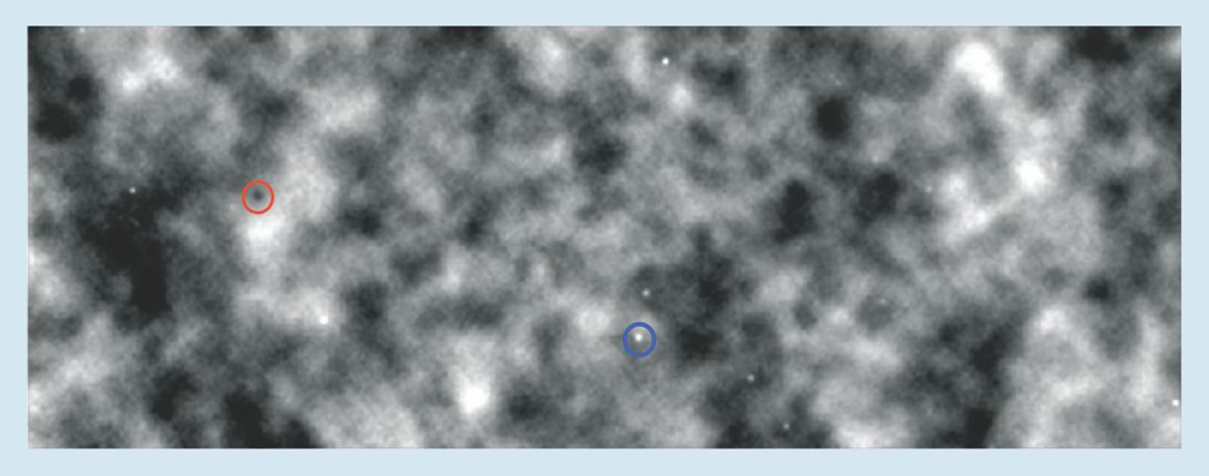 Figure 2. A microwave map of a 3°-by-9° patch of sky, constructed with some of the data from the Atacama Cosmology Telescope. Light and dark areas represent hotter and colder microwave temperatures, respectively. The large-scale structure is the cosmic microwave background; smaller dots (such as those circled in red and blue) are point microwave sources and clusters of galaxies. (Courtesy of the ACT collaboration.)