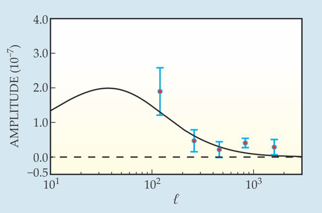 Figure 3 shows the resulting convergence field’s multipole components. The black line is the expected power spectrum of the field, derived from a standard cosmological model. Assuming a power spectrum of that expected shape (but not necessarily the same amplitude), the ACT researchers found that their data establish at the 4σ level that the convergence field is nonzero—that the CMB has been distorted by gravitational lensing.