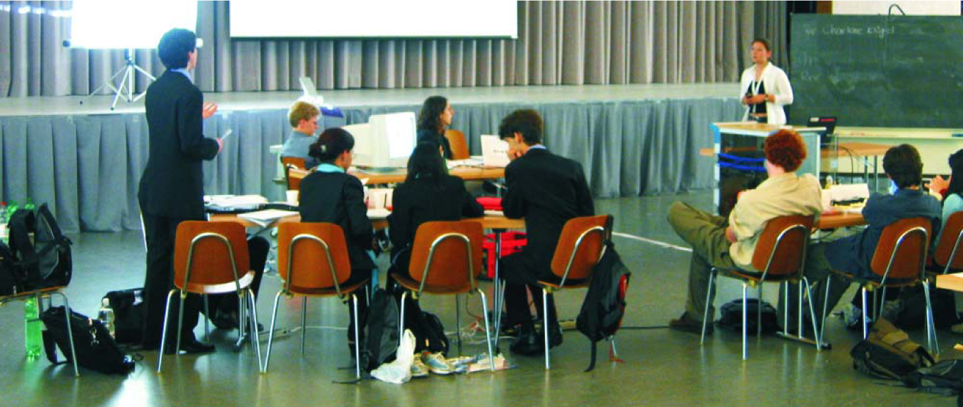 Teams from Brazil and Switzerland engage in a physics fight at the 2005 International Young Physicists’ Tournament.