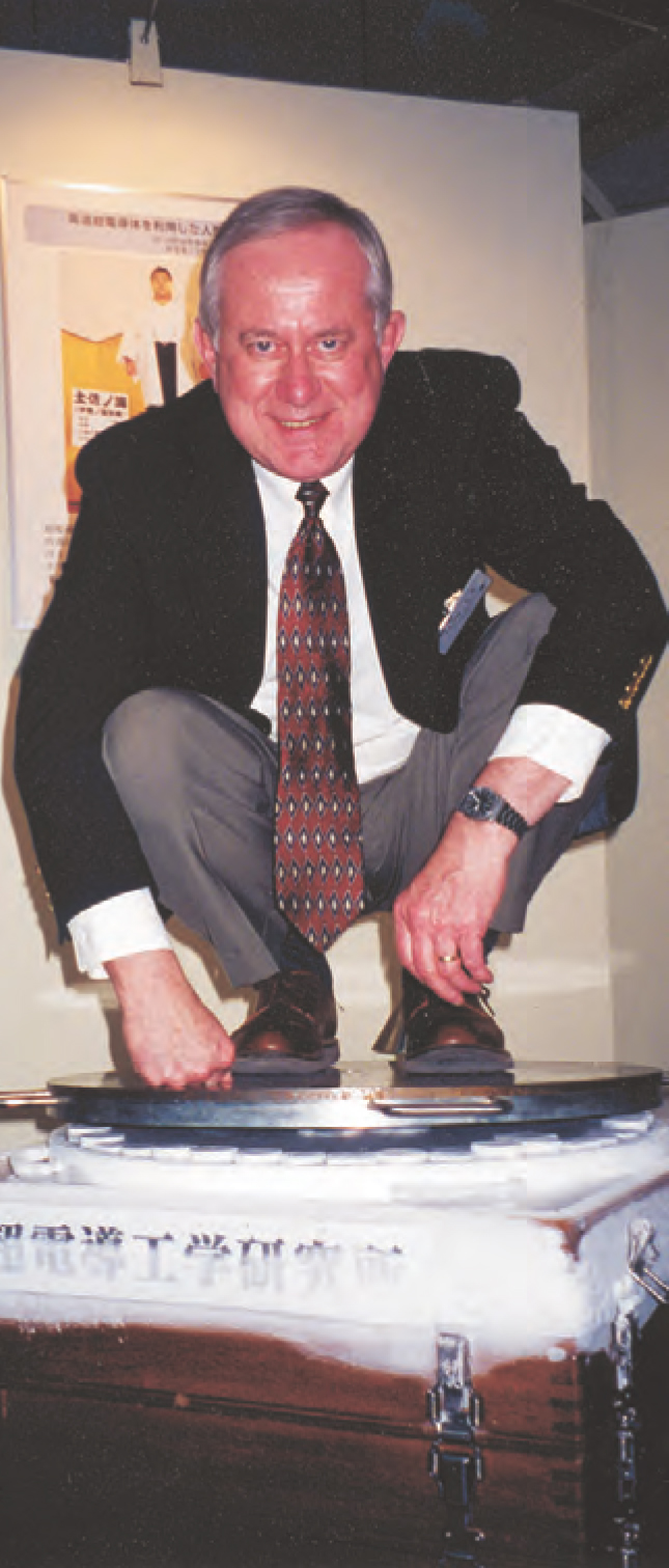 Suspended: John R. Clem, science editor of the now defunct High-T c Update, is magnetically levitated above superconducting YBCO disks.
