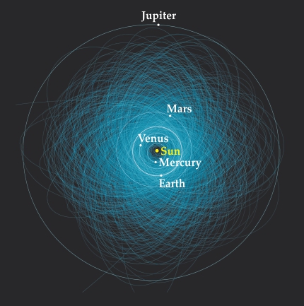 Paths of the known potentially hazardous near-Earth objects larger than 140 m as of early 2013. None of the 1400 objects are considered a threat over the next 100 years.