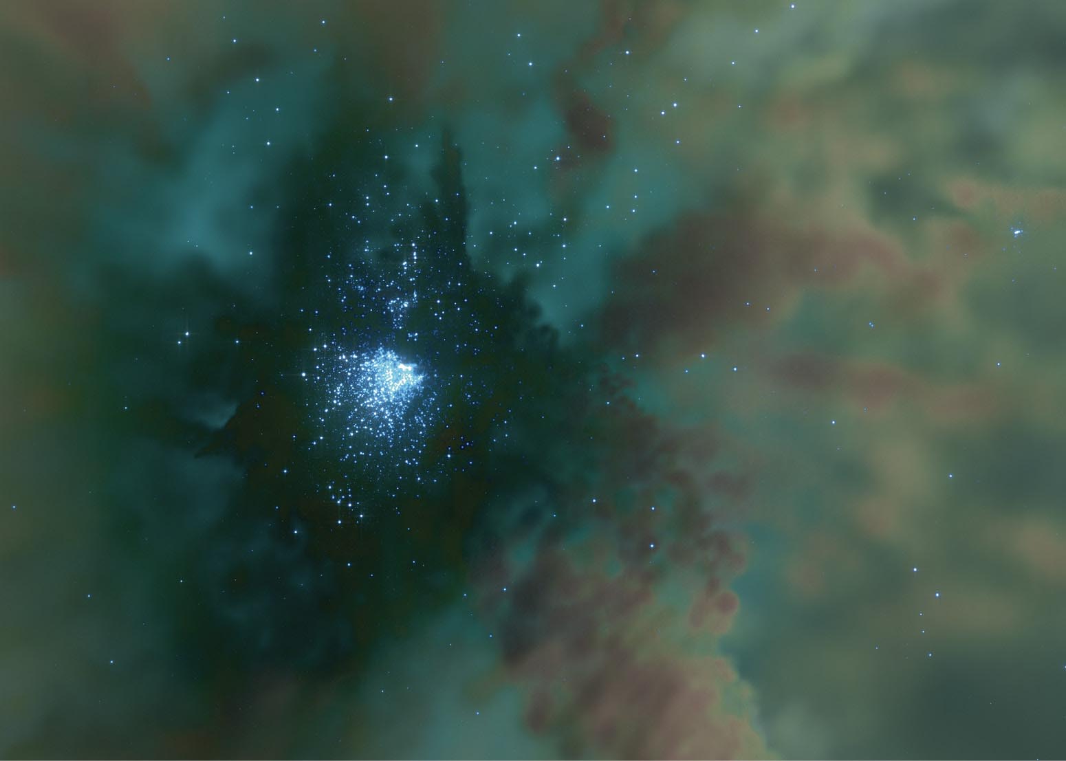 A cluster of stars (blue dots) forming in a giant molecular cloud, as visualized in this artistic rendering. Simulations indicate that runaway collisions of stars in a gas cloud can create the very massive stars that can produce intermediate-mass black holes. Although astronomers have documented the existence of stellar-mass and supermassive black holes, the black holes’ midsize counterparts have proved more elusive. (Courtesy of Michiko Fujii and Takaaki Takeda.)