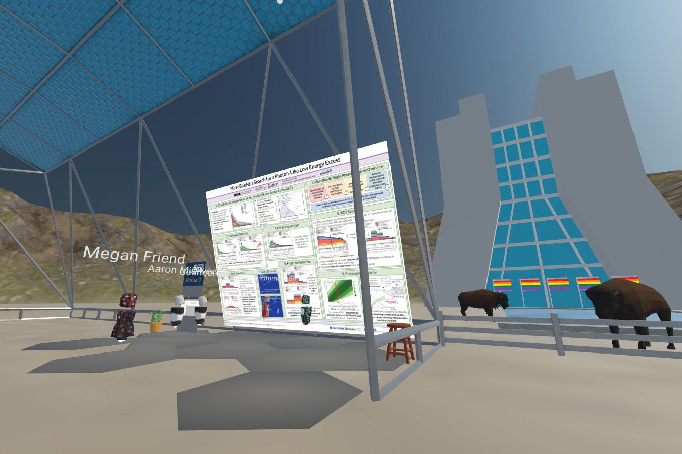 Virtual reality is one way to connect, as in this poster session from the Neutrino 2020 conference. But enthusiasm for such approaches is fading as conferences resume in person.