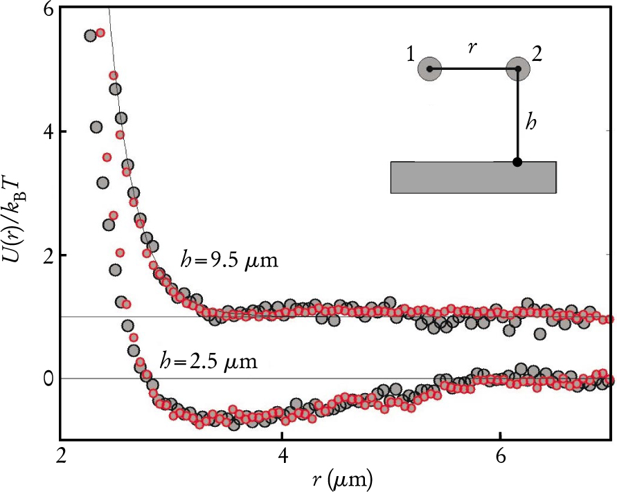Figure 2. With hydrodynamic effects incorporated, simulations of the motion of two charged spheres 0.65 µm in diameter near a similarly charged wall quantitatively account for the observed motion. Here, the simulated1 (red) and the observed2 (gray) motions have been analyzed as if they were due to forces given by the gradients of an effective potential U that depends on the interparticle separation r, for two values of the distance h from the wall (offset for clarity).