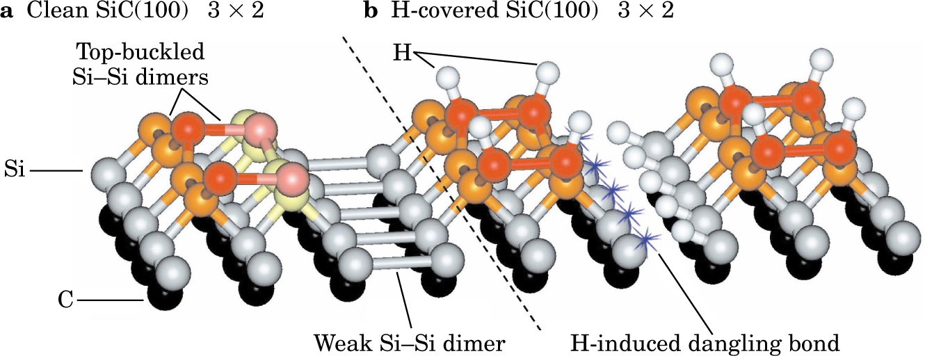 Figure 1. The reaction of silicon carbide with atomic hydrogen creates a one-dimensional chain of metallic surface states. Atomic models distinguish a clean SiC(100) (3 × 2) surface from a hydrogen-covered one. (a) A top (red/pink) adlayer of tilted Si-Si bonds (dimers) covers a second layer of Si dimers (orange/yellow) oriented orthogonal to the first layer. A third monolayer of Si atoms (silver) bonds to a layer of carbon (black). (b) Atomic hydrogen (white) ties up (“passivates”) the singly occupied dangling bonds on the clean-surface dimers (effectively untilting them) and breaks the third-layer weak dimer bond. That bond-breaking leaves one Si atom available to form a Si—H bond, and leaves the other atom caged in by the geometry. Such blocking stabilizes the newly formed dangling bond on the Si.